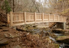 エクステリア既存の鋼桁を再利用し、木部を現状にあわせてリニューアルした木橋。滝川渓谷(福島県)