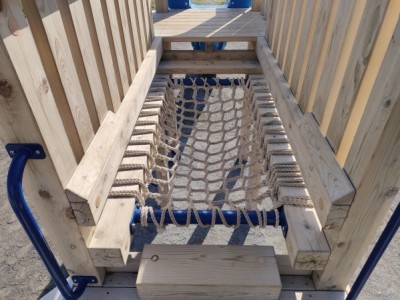大網白里市の住宅地内の公園に、で木製遊具を納入させていただきました。高さ2mのデッキからのすべり台を中心に様々な難易度の登りアイテムがついた遊具です。