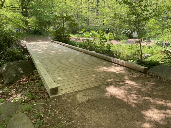 新宿御苑は皇室の庭園として造られましたが、戦後、国民公園となり、多くの利用者が訪れるスポットとなっています。園内には、様々な木製施設がありますが、当社でも木橋やデッキ、橋の高欄などのリニューアルを複数行なっています。玉藻池にかかる3号橋はアルミ桁を使用。6号橋は、コンクリート桁に木化粧を施して、既存構造物にあわせた設計、製造を行ないました。また、「母と子の森」エリアでは、通常の木橋だけでなく、池の上にジグザグに折曲がって架かる八ツ橋もリニューアルしています。