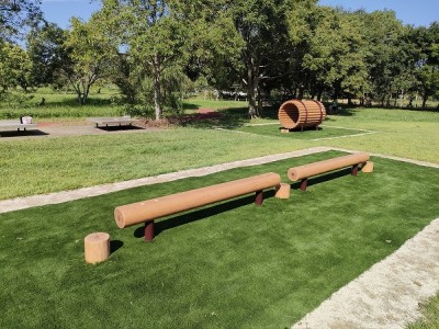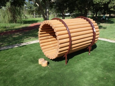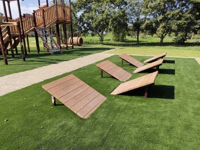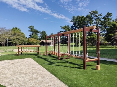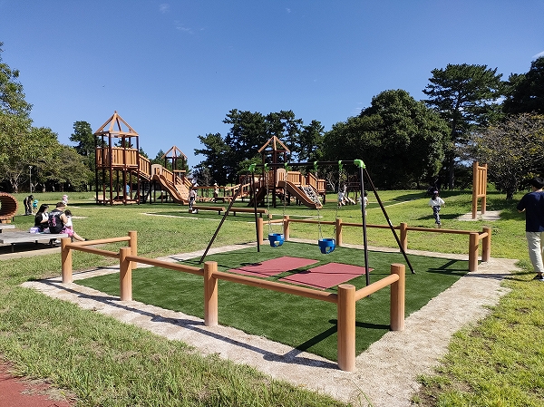 茨城県稲敷市の和田公園にコンビネーション遊具、アスレチック遊具、ブランコなどの遊具を納入いたしました。これらの遊具は、主要構造部である柱に防錆処理を施したスチールを使用し、耐久性を高めたテツモク遊具となっています。茶色やベージュを中心としたアースカラーが、緑豊かな自然景観によく馴染みます。コンビネーション遊具は、葉っぱのモチーフを随所に取り入れたデザインと全3ケ所に取り付けたシンボル性が高いフレーム屋根が特徴です。また、ブランコは小さなお子様でも安心して楽しむことができるバケットシート仕様になっています。