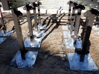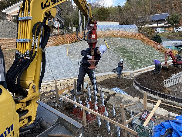 基礎には、平鋼をらせん状にねじったGTスパイラル杭を使用しています。軟弱地盤での対応が可能で、撤去も簡単な工法です。