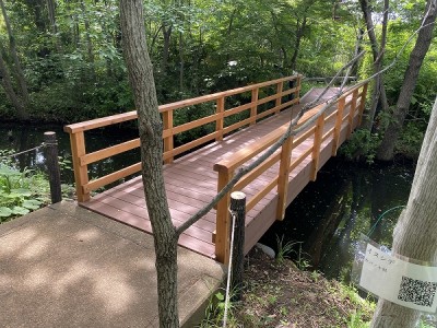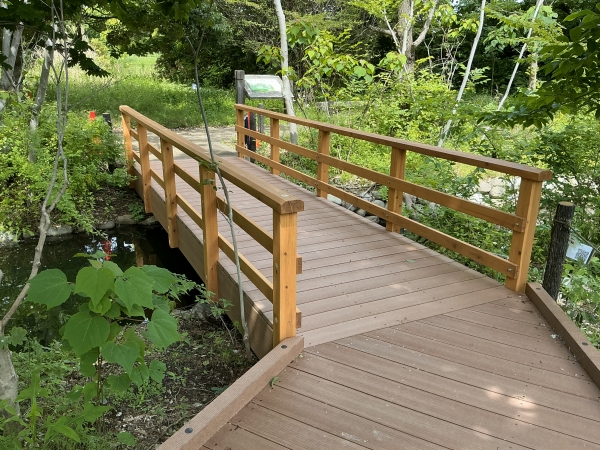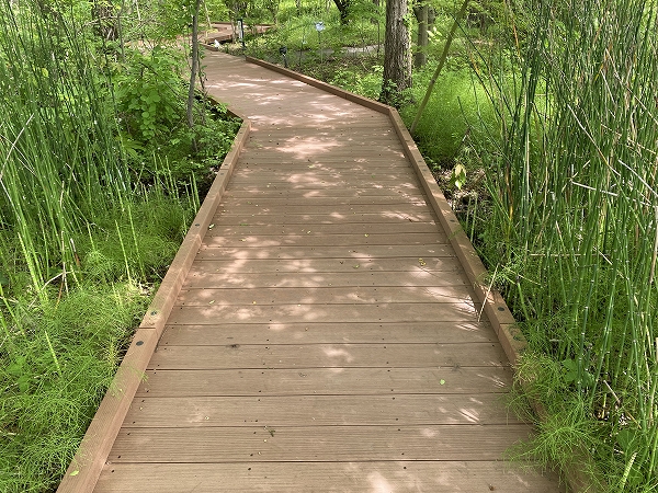 木道の床板には合成木材を使用し、自然環境に調和する美しい外観とともに、耐候性・耐久性にも優れた仕上がりとしました。環境学習や散策の場として、多くの方に安心して長くご利用いただける木道となっています。また、あわせて木道に連結する2つの木橋も当社で納入しています。