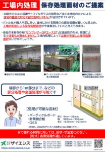 | 保存処理面材 | 防腐防蟻処理耐力面材のご提案 | 住宅の省エネ性能の向上で注目されている耐力面材。 工場で防腐・防蟻処理を施した品質管理・工程管理に優れた保存処理面材のご提案。 |