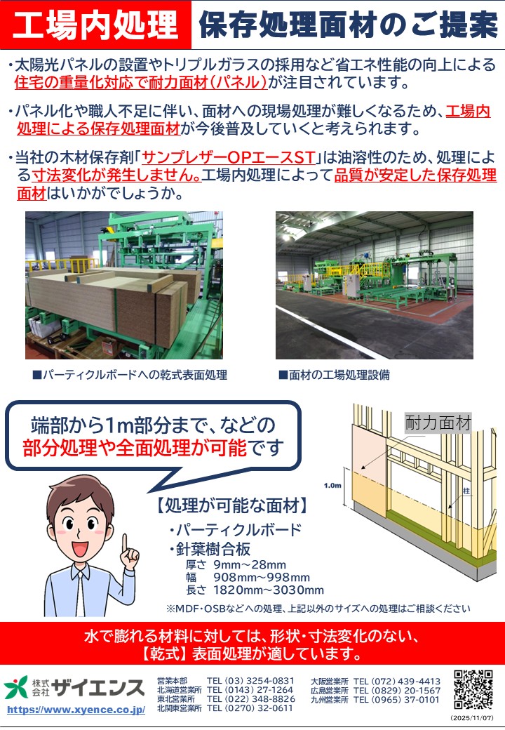 戸建て住宅の壁用のパーティクルボードへの保存処理が中心ですが、非住宅の厚物床合板、軒天用のシナ合板などの