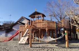 今回ご紹介するのは、千葉県我孫子市の宮の森公園に納入した木製コンビ遊具の事例です。お客様の要望にあわせた特注サイズのデザインです。緑豊かな空間に木製の遊具がなじみます。
