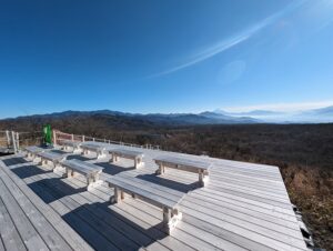 清里高原や南アルプスの山並みを望む展望デッキ。美し森(山梨県)